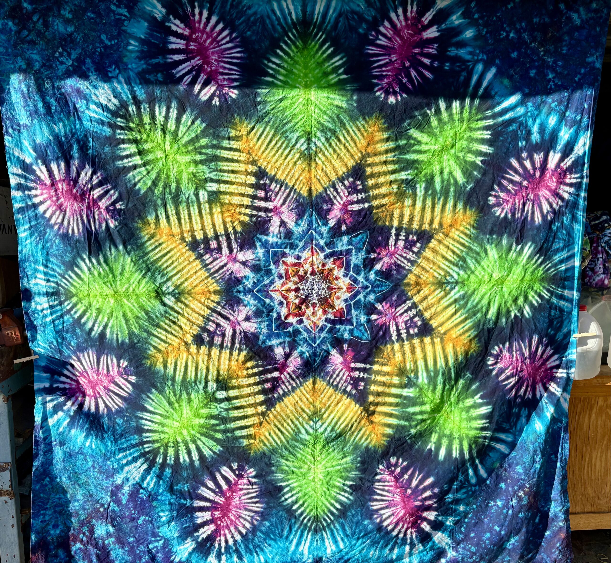 Beautiful eight-point dreamcatcher star tie dye tapestry measuring 72 inches by 80 inches.
