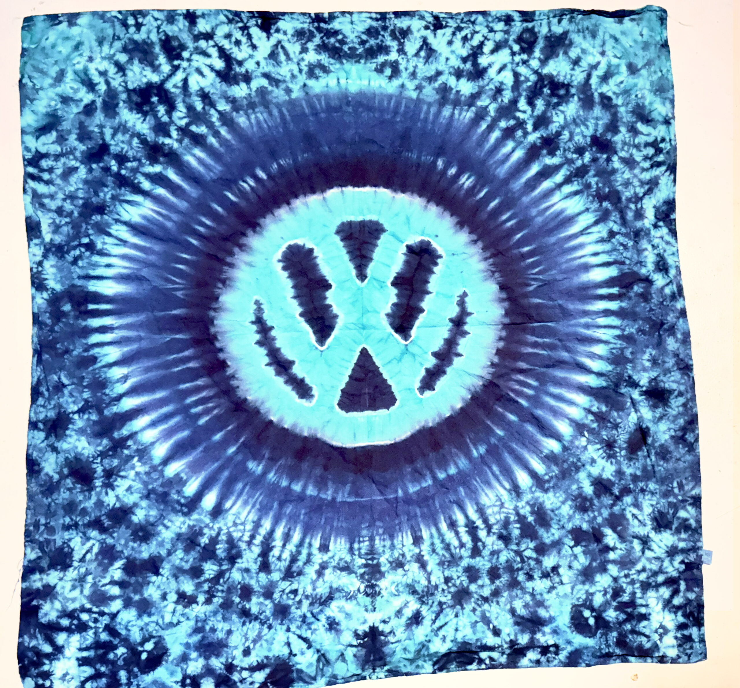 27 inch by 27 inch blue tie dye Volkswagen VW logo bandana.